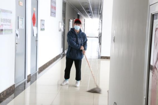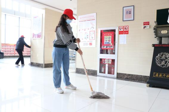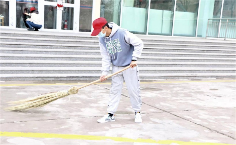 本次活动的主要内容是清扫学院内部卫生以及周边绿化带角落里的白色垃圾,清理玻璃上的水渍与灰尘。上午12点,大一的志愿者在学院门口集合,领取扫帚、抹布等劳动工具,在学生干部的带领下,同学们在各自分配的工作领域开始认真细致的清扫。