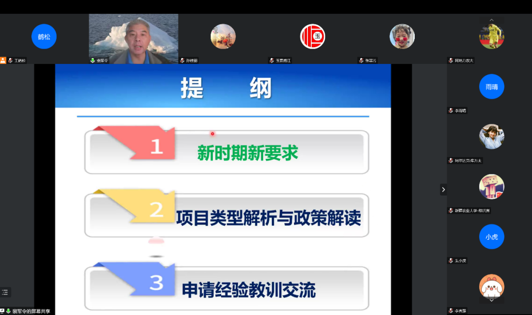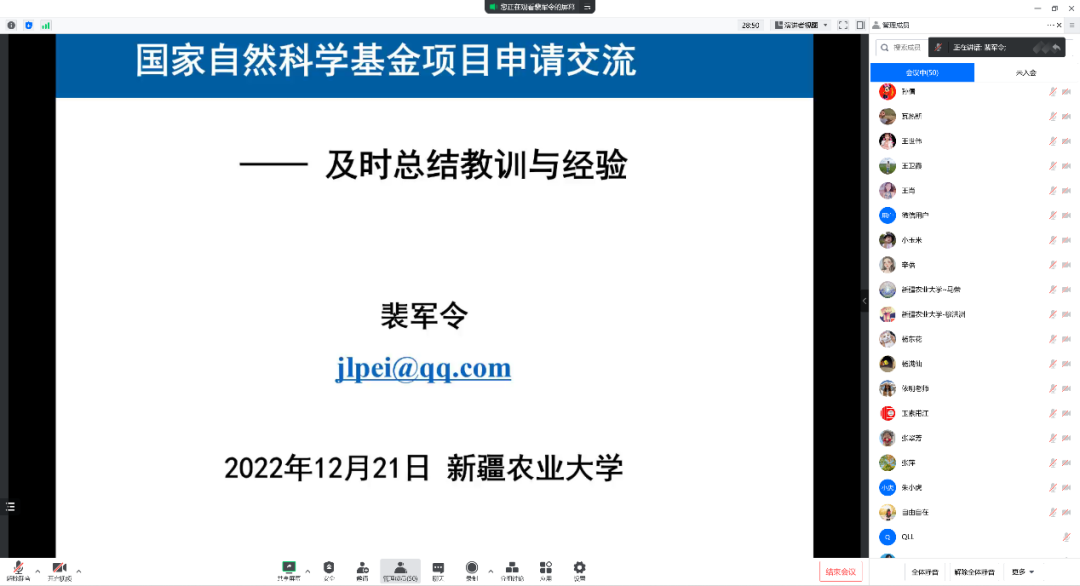 为全面促进国家自然科学基金项目的申报工作,进一步提高教师基金申报质量和水平,做爱动画 于2022年12月21日以线上的形式举办了“八一讲堂”学术交流会。学院邀请到中国地质科学院裴军令研究员做了关于“国家自然科学基金项目申请交流”的报告,会议由校科技处副处长玉素甫江主持,全校拟申报教师参加了会议。