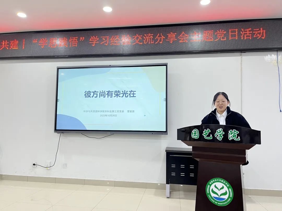 园艺学院本科生第一党支部郭雨晴同志,从学习、生活、科研、竞赛等方面为大家进行分享。郭雨晴同志的分享,展现了她作为一名党员积极乐观的生活态度,勤奋好学的科研态度。