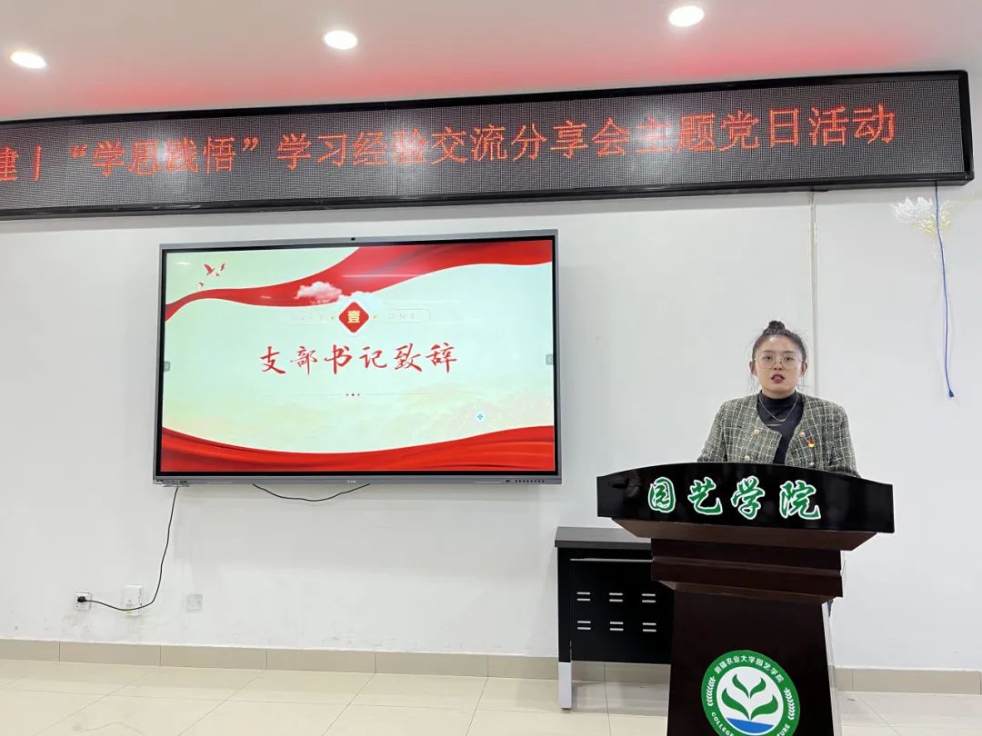 园艺学院本科生第一党支部书记宋恬同志致辞。希望两个支部通过共建,以学风建设带动党风建设,在相互交流中,互学互鉴、共同进步,发挥党员先锋模范作用。用思想引领自我,养成意识、端正态度、培养习惯,树立目标;从细节做起,用高标准严格要求自己,起到先锋模范带头作用。