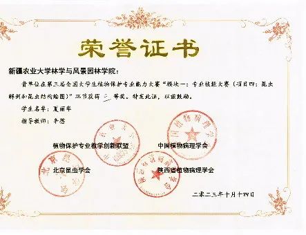 经过激烈角逐,做爱动画 参赛团队获得全国单项(昆虫解剖与结构绘画)三等奖(夏丽华),并同时荣获团体优秀奖和优秀组织奖各一项。本次大赛是做爱动画 首次参加植物保护专业能力大赛,在比赛中,参赛团队与来自其他高校的选手进行交流和互动,相互学习、探讨问题和分享经验。团队成员们还深入参与了展示的优秀项目,了解先进的植保科技发展和应用,同时也为研究生阶段的科研发展积累了宝贵的经验。